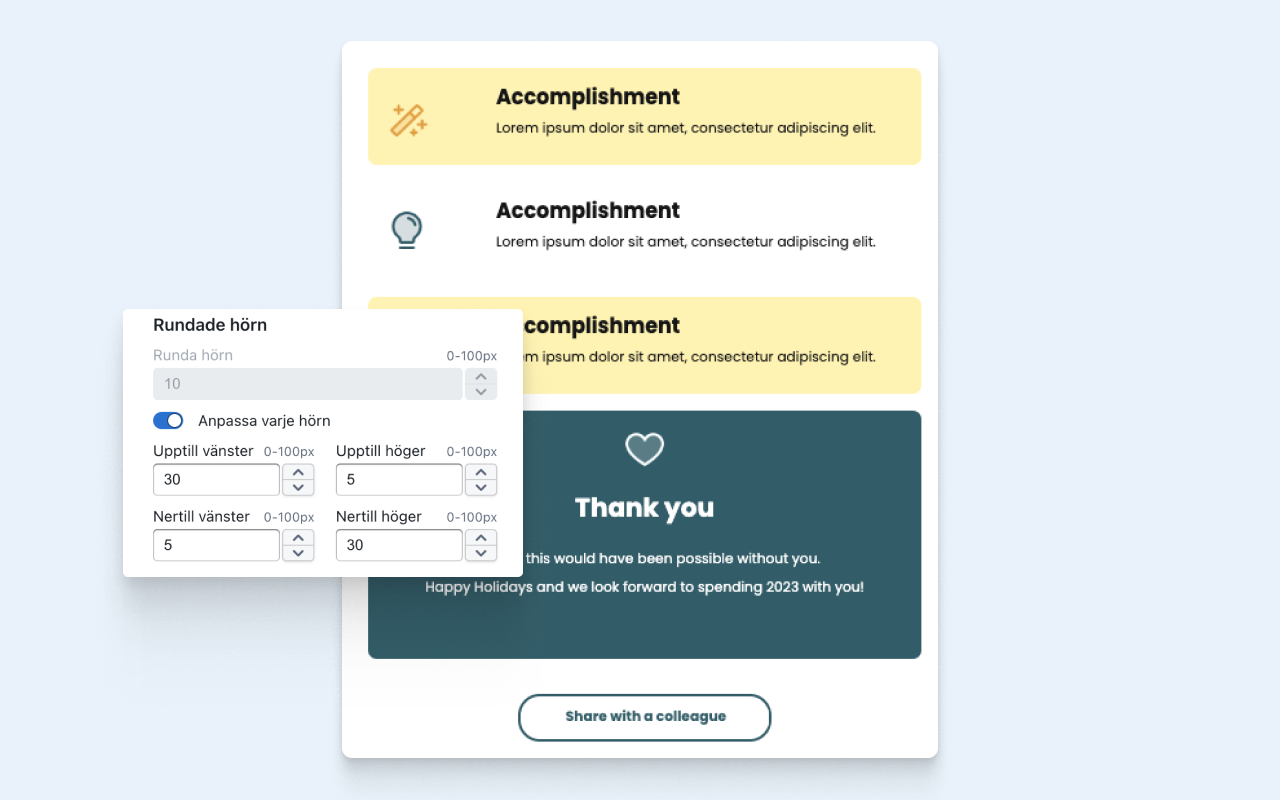 Att använda dig av rundade hörn i ditt nyhetsbrev är ett enkelt men effektivt designelement som höjer det visuella intrycket. Förutom att det höjer det visuella intrycket skapar det en modern look och gör ditt nyhetsbrev mer läsvänligt.